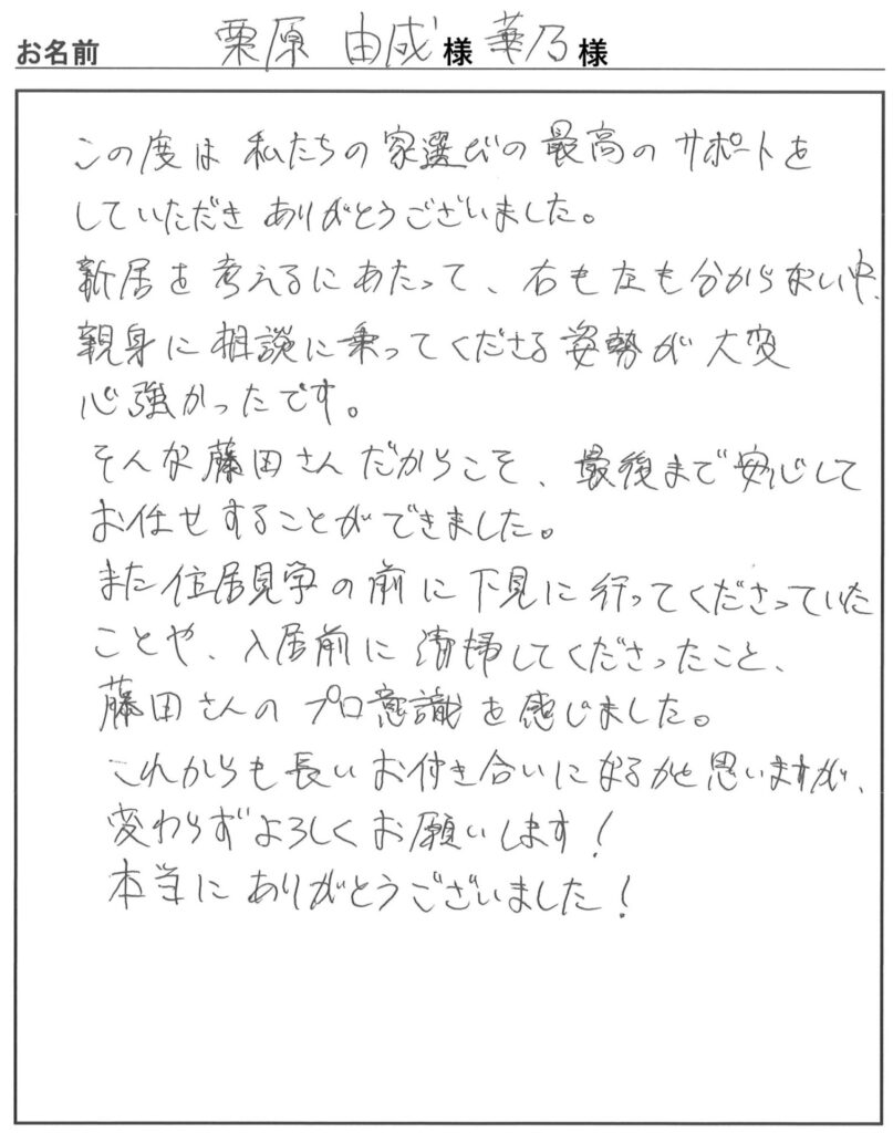 栗原様、この度はご入居おめでとうございます!これからも、末永いお付き合いをお願いいたします(^^)