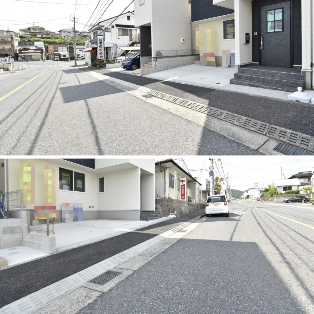 前面道路は、公道 北東約12m。メイン道路の為、朝や夕方のラッシュ時間は、車の通りが多くなりそう。