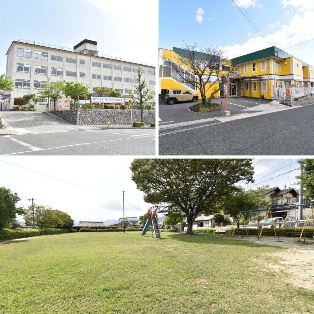 左上・学校区は「毘沙門台小学校」(約850m 徒歩11分)/右上・「認定こども園サムエル信愛こどもの園」(約300m 徒歩4分)/下・ベランダから見える「毘沙門台中第三公園」(約110m 徒歩2分)。ボールが使えるので、サッカーやキャッチボールを楽しめます。