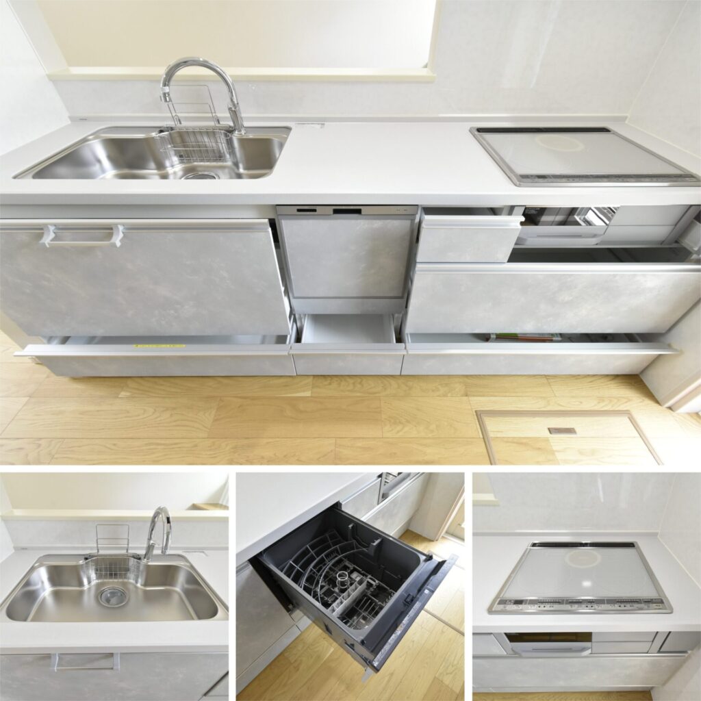 上・手元を隠せる立ち上がりキッチン。散らかりがちなキッチンの中を見えにくくし、生活感を隠すことができます。/左下・シンクのタッチレス水栓は、手をかざすだけで水が出せるので、調理中でも衛生的!/中・家事の助っ人、食洗機も完備です。/右下・IHクッキングヒーターは、フラットな天板で、汚れても拭き取りやすいくお手入れラクラクですよ♪