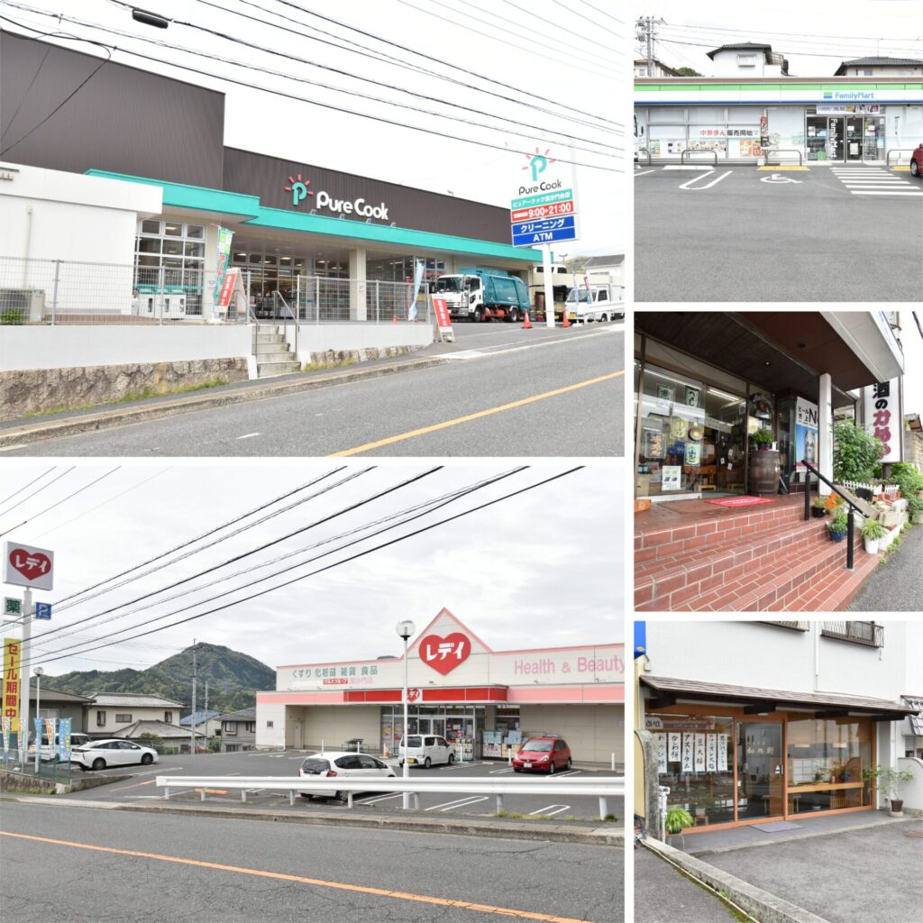 左上・新鮮な生鮮食品が並ぶ「ピュアークック 毘沙門台店」(約190m 徒歩3分)。お店の前には、ATMが設置されています。団地内で銀行手続きも済ませられるのは嬉しい♪/左下・「くすりのレデイ 毘沙門店」までは、徒歩2分!薬や日用品もサッと買える近さで便利。/右上・くすりのレディ向かい側にある「ファミリーマート毘沙門店」(約100m 徒歩2分)。/中・酒屋「かめや」(約22m・徒歩1分)は、物件から2軒隣。変わり種のお酒をゲットできそう。/右下・和菓子屋「和兵衛」。毘沙門饅頭と、子どもの日のちまきが名物です。