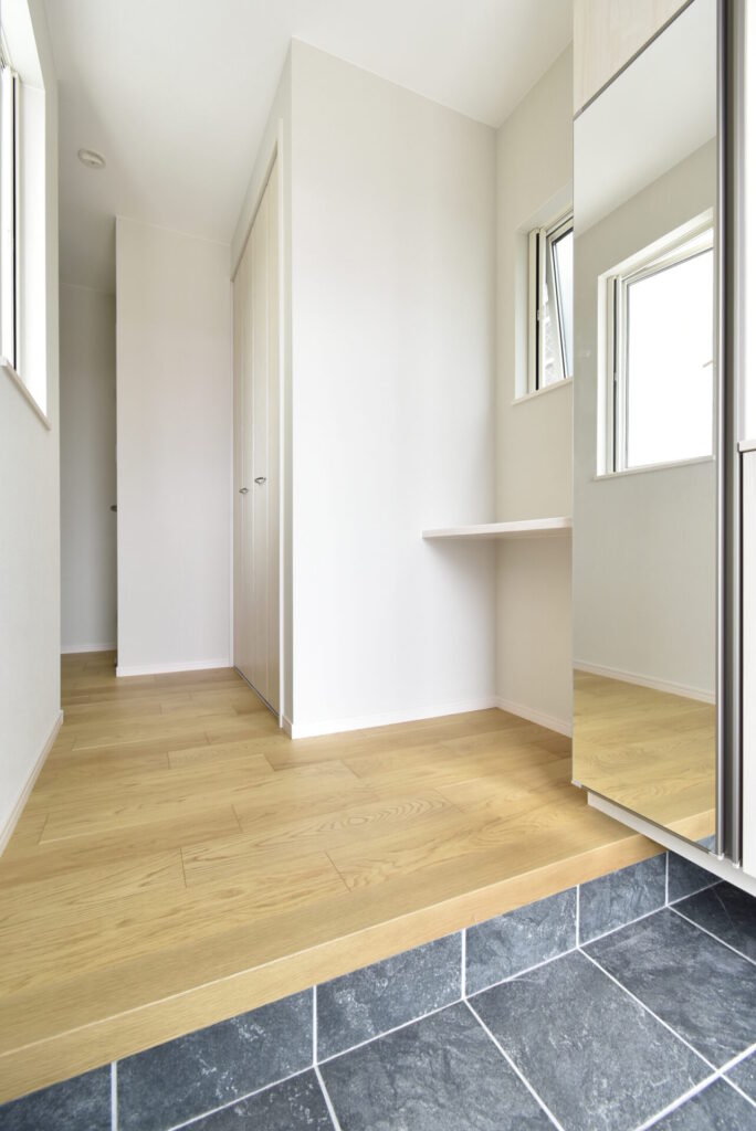 両側の窓から光が差し込む、明るい玄関ホール。玄関に入るたびに気分も上がりそう♪
