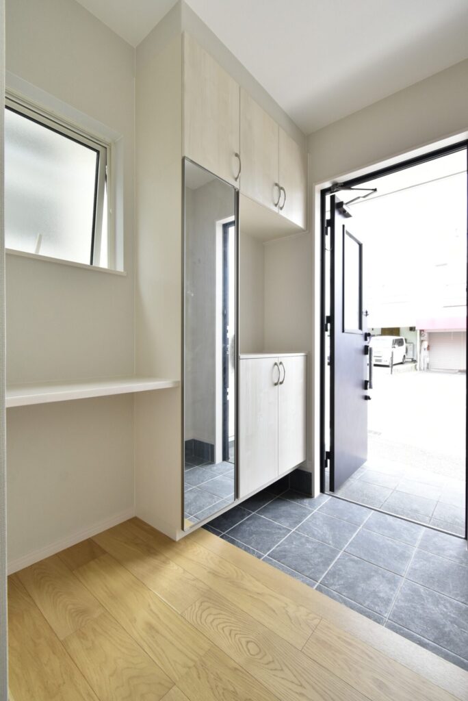シューズボックスは姿見付きで、外出前の身だしなみチェックが可能。靴は約32足しまえます。横には、鍵をポンッと置けるカウンターも完備されていました。
