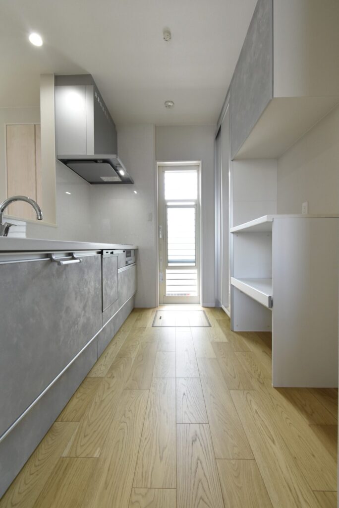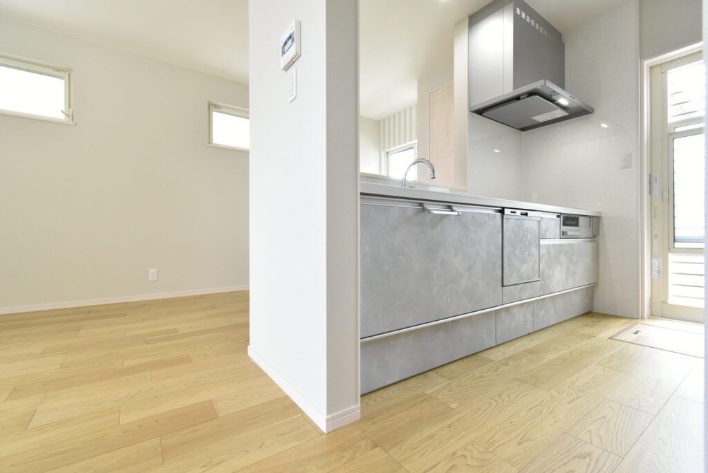 キッチンは、ナチュラルな雰囲気に調和する淡いグレー。