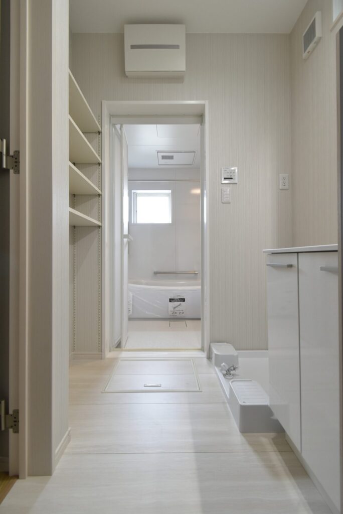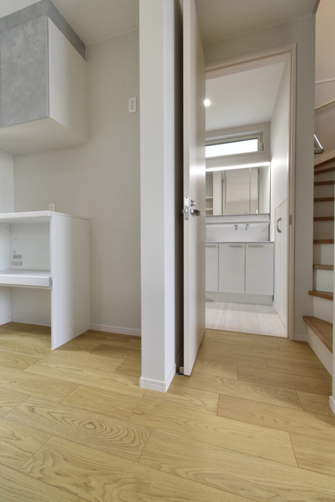 キッチン裏手は洗面室。キッチンと洗面室が近い間取りは、家事を同時に進めやすく時短につながります。また洗面室そばに、2階へ続く階段があることで、ベランダまでの距離が最短となり洗濯家事をラクにこなせます。