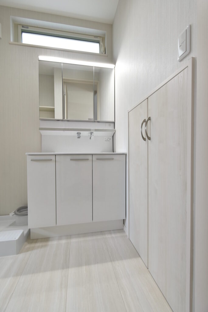 入口には、階段下収納がありました。シャンプーや洗剤等のストック置きに便利。洗面台の照明は、手をかざすだけでON・OFFができるタッチレスタイプ。手の汚れを気にせず操作できます。