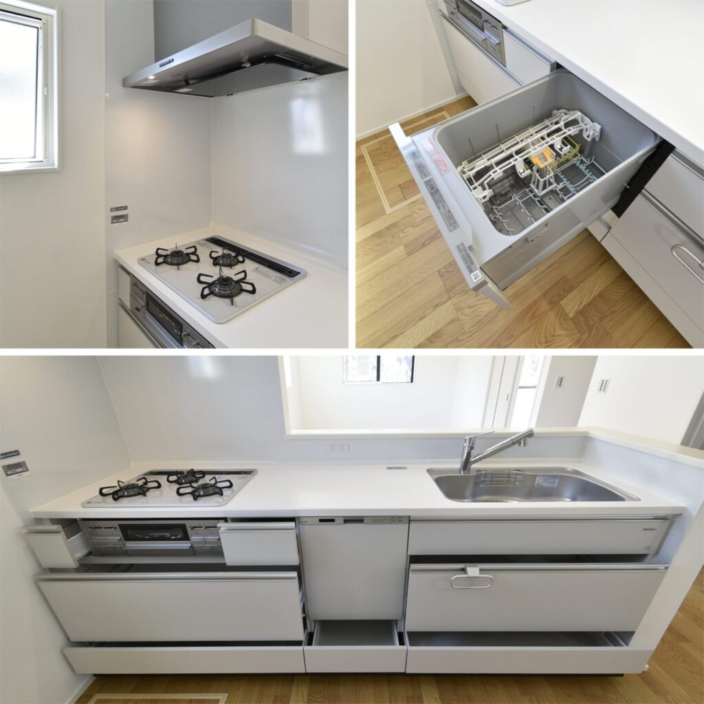 左上・3口ガスコンロは、強い火力でスピーディーに調理できます。/右上・食事の後片付けを楽にしてくれる食洗機を完備。/下・キッチンにはコンセントがあり、ミキサーなどの調理家電が使用可能。キッチンの壁は、マグネットアイテムがくっつけられるので、調味料などを浮かせて収納できます。キッチン収納は、奥のモノまで見やすく、取り出しやすいスライド式です。