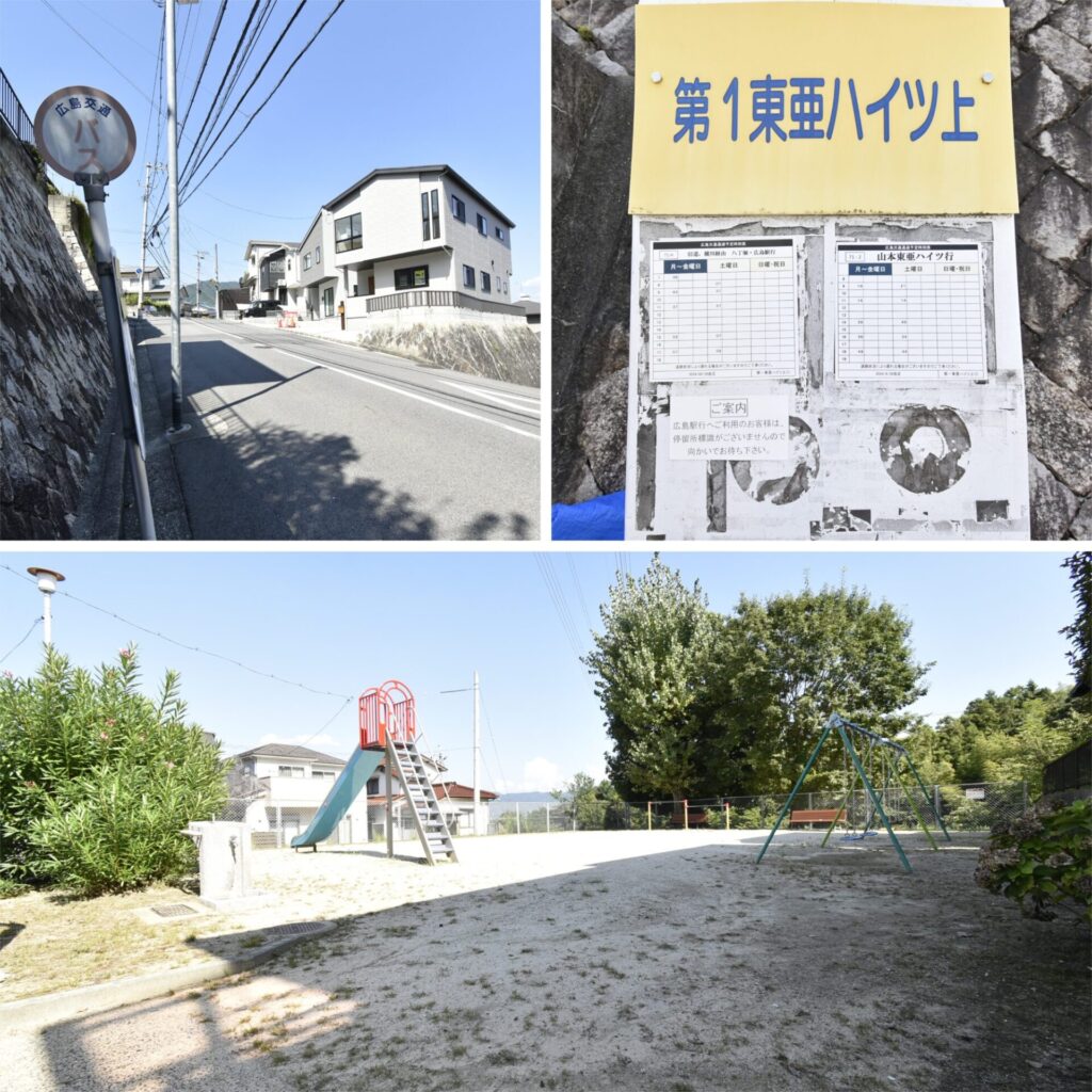 上・物件の目の前にバス停があります。旧道を通る路線で、横川経由、八丁堀・広島駅までアクセス可能。広島駅方面に向かう停留所標識はないので、バス停の向かい側に立って手を挙げると、バスが停まってくれるそうです。/下・すべり台やブランコが揃う「山本第二公園」(約180m 徒歩2分)。子どもが遊ぶ姿をベンチに座って見守ることもできますよ♪