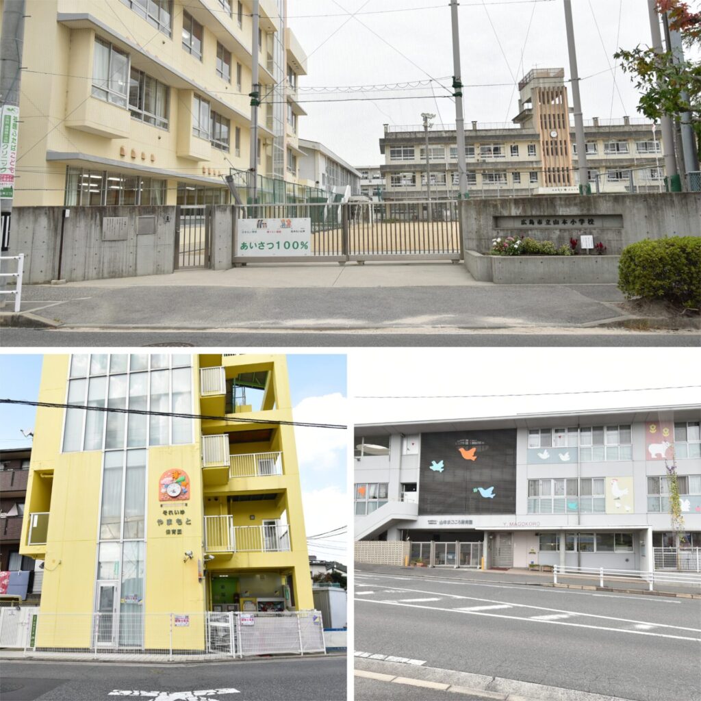 上・学校区は「山本小学校」(約750m 徒歩10分)/左下・「やまもと保育園」(約750m 徒歩10分)/右下・「山本まごころ保育園」(約750m 徒歩10分)。毎日の送迎もスムーズにできる距離感です。