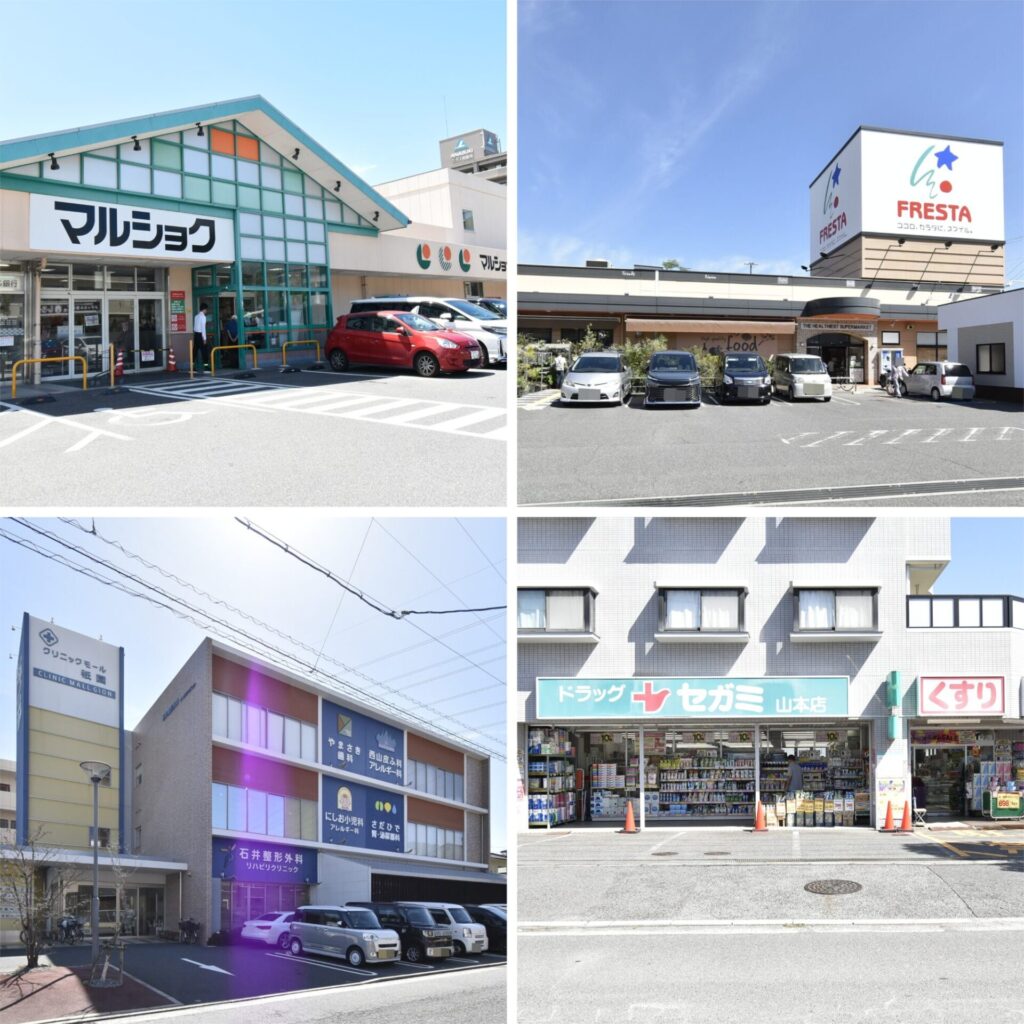 上・最寄りのスーパーは「マルショク山本店」(約900m 車4分)。近くには「フレスタ東山本店」(約1km 車4分)もあります。フレスタの”ぶちうま!広島ハーブ鶏もも醤油から揚げ”は、西日本スーパー惣菜部門で最高金賞を受賞されたそうです♪/左下・小児科や歯医者などが入る「クリニックモール祇園」(約800m 車3分)/右下・「セガミ山本店」(約900m 車4分)。スーパーや、病院、ドラッグストアなど、生活の便利が揃う、暮らしやすい環境です。