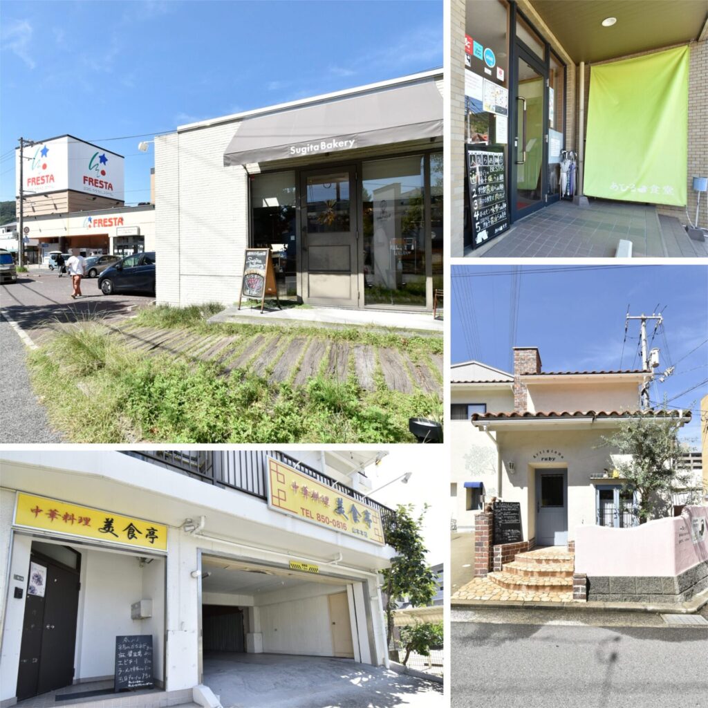 左上・フレスタ横にある「スギタベーカリー」(約700m 車3分)は、パンの種類が豊富。添加物やマーガリンを使用しない”スギタパン”は、オープン当初から人気と評判です♪/右上・ラーメン屋の「あひる食堂」(約700m 車3分)。/左下・地元で人気の中華料理「美食亭」(約700m 車3分)。バイキング形式なので、もりもり食べたい日にはこちらへ。/右下・お洒落なイタリアンレストラン「アルディジャーノルビー」(約750m 車3分)。ご夫婦の記念日にどうぞ♡