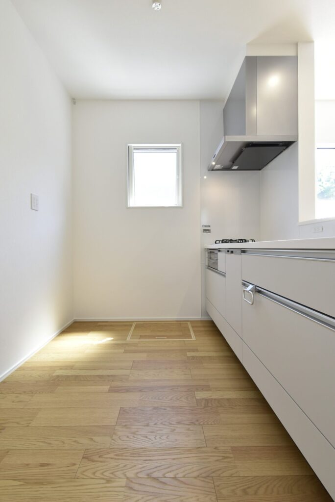 窓から光が差し込み、明るいキッチン。床には、非常用の飲料水や缶詰め等のストックが可能な浅めの床下収納がありました。