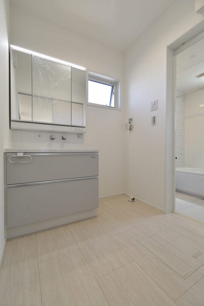 洗面台の収納は、キッチンと同じくスライド式の収納です。浴室前の床下収納は浅めでした。