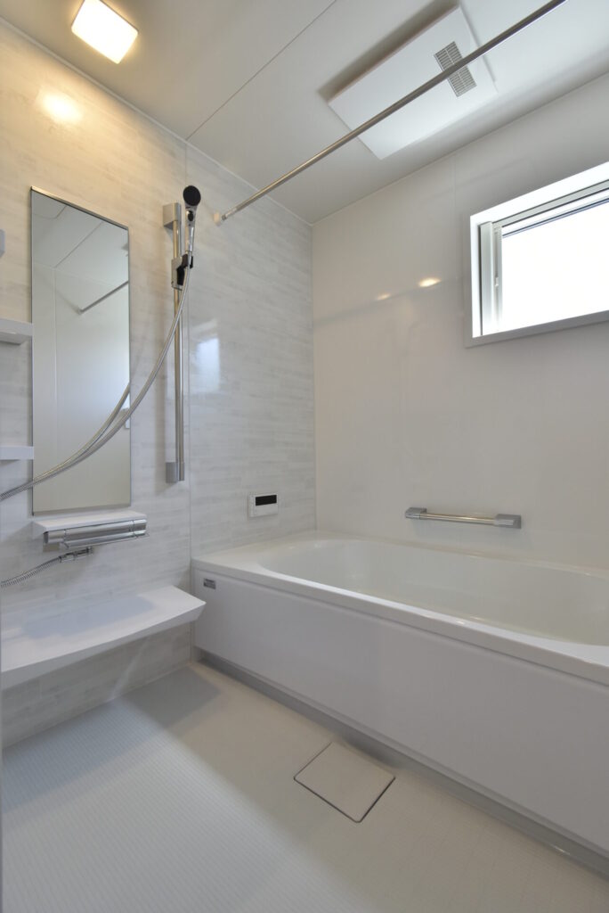 暖房乾燥換気付きの浴室。壁はマグネット仕様で、シャンプーや小物を浮かせて収納できるので、掃除もラクラク!