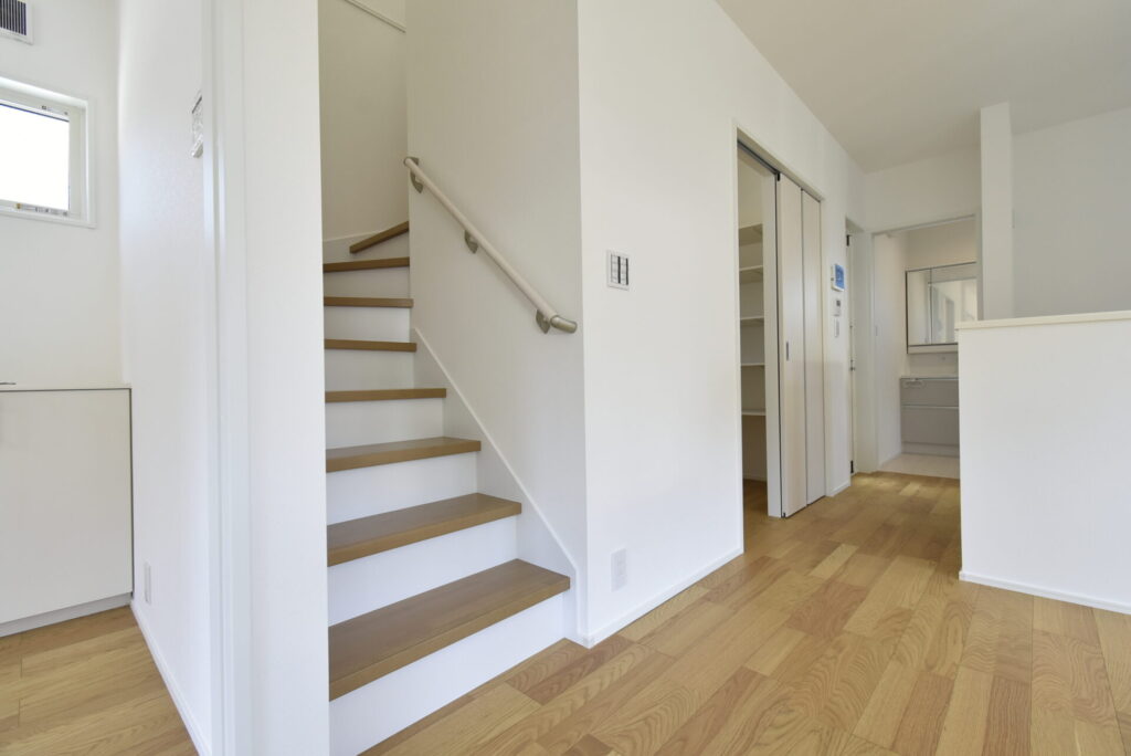 リビング階段は、エアコンの空気が階段を通じて2階へ逃げてしまうので、暖房の効きが気になる方は、ロールカーテンを取り付ければ◎