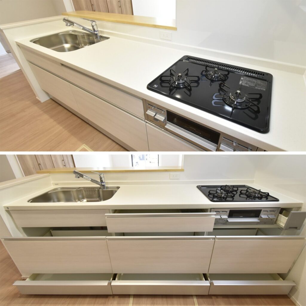 上・シンクは、大きなお鍋も洗いやすい広さです。コンロは、炒めて、沸かして、温め直すが同時にできる3口のガスコンロ。高火力で炒め物にも最適!/下・キッチン収納は、収納力の高い引き出し収納です。奥行きがあり、キッチン用品をスッキリと収めることができますよ。