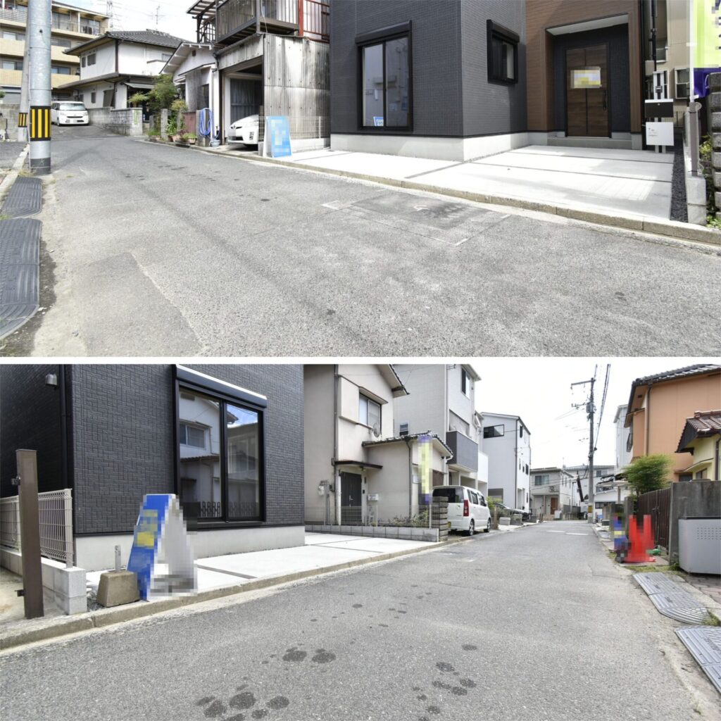 前面道路の幅は、約4m。車の通りは少ないため、落ち着いて駐車することができます。
