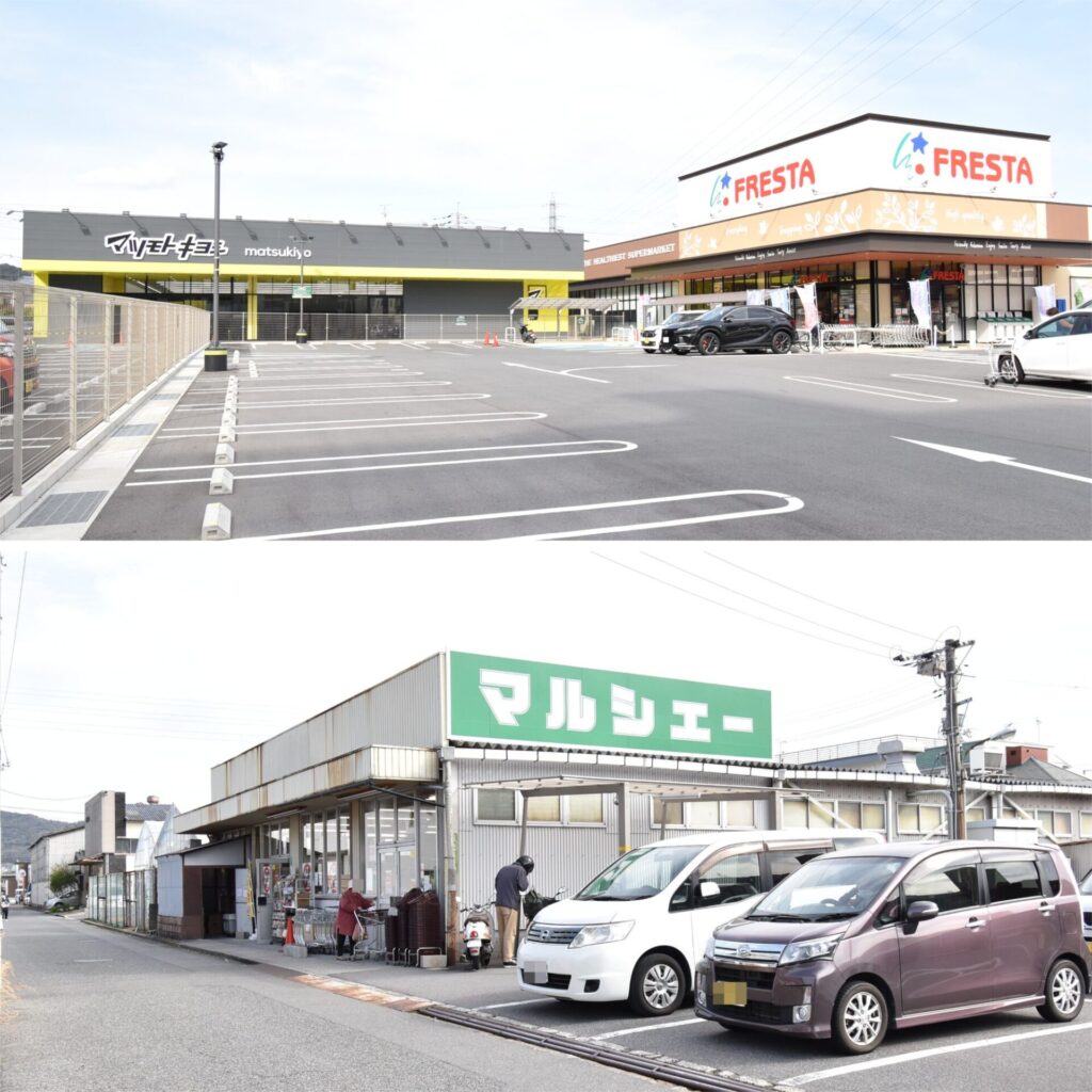 上・「フレスタ長束北店」までは徒歩4分(約270m)。チャリなら1分で到着!21時まで開いているので、お仕事帰りに利用することもできます。お隣には、ドラッグストアの「マツモトキヨシ 広島長束店」もあり、食料品や日用品のお買い物はここで完結!この距離なら、買い忘れもへっちゃらですよね♪/下・さらに、お買い得な商品が揃う「マルシェー長束店」もあるので、気分や目的に合わせて使いわけられます(約550m 徒歩7分)。
