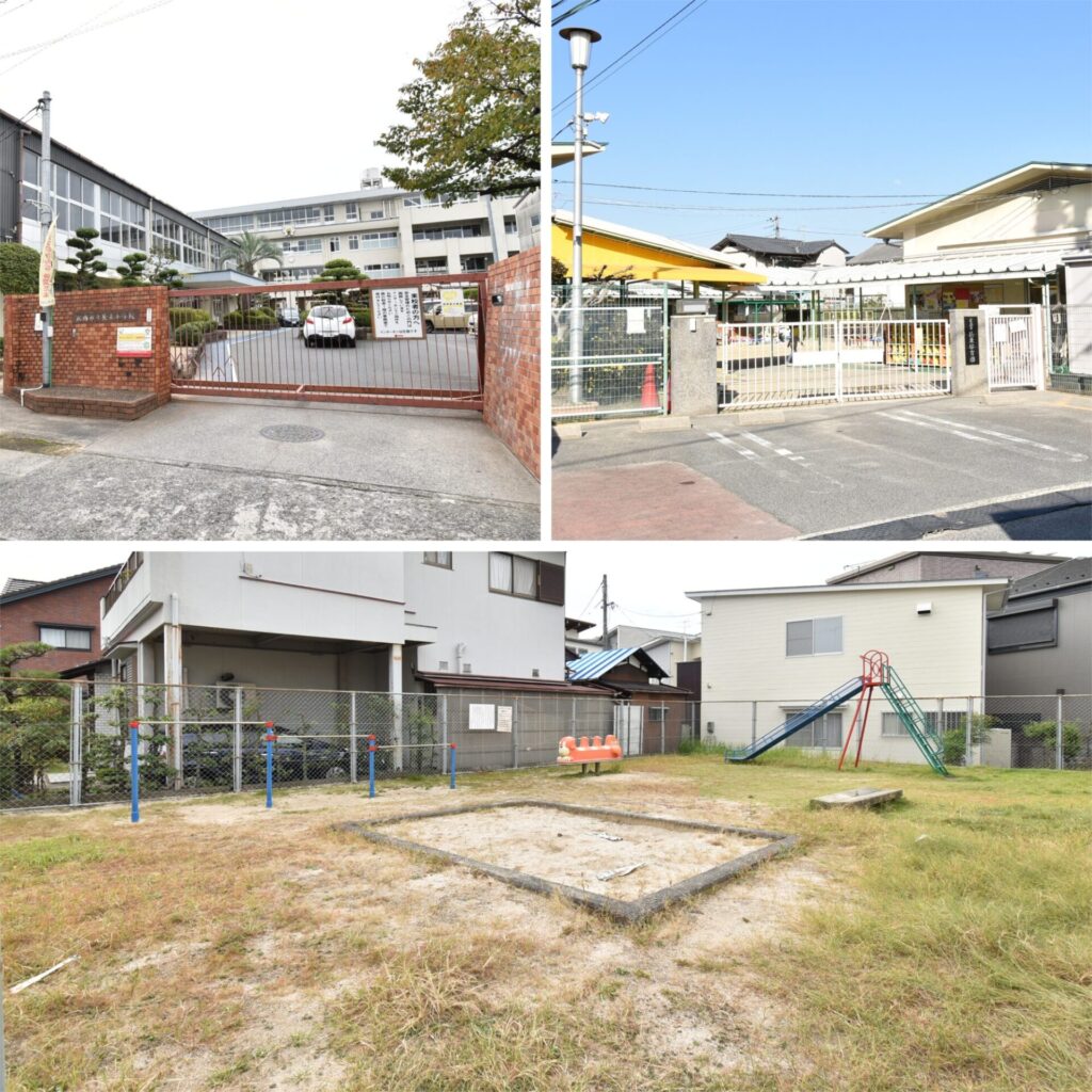 左上・学校区は「長束小学校」(約1.1km 徒歩14分)/左下・「長束保育園」(約500m 徒歩7分)/右下・ちょっぴりローカル感漂う「ちびっこ広場」(約260m 徒歩4分)。隠れ家みたいな公園で、子供とのんびり遊べそうでした♪