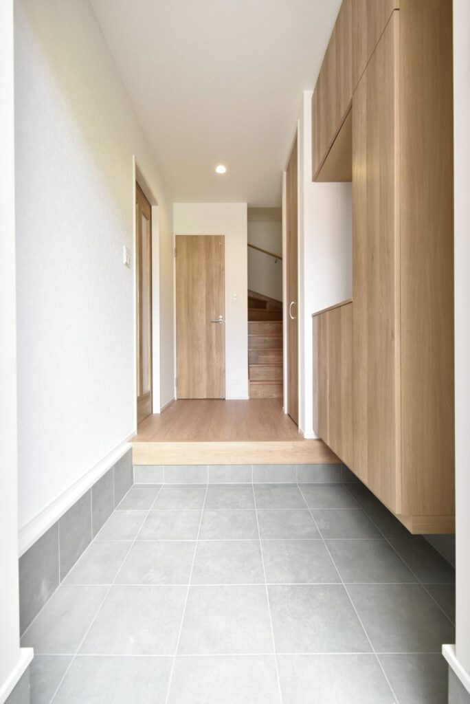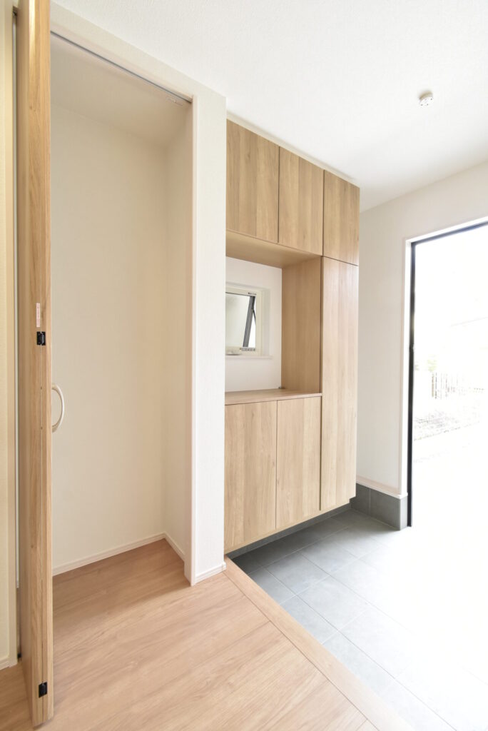 床や建具から木の温もりを感じる玄関。帰るたびにホッと心が安らぐ空間です。右手のシューズボックス横には、傘立てを置けるスペースもありました。