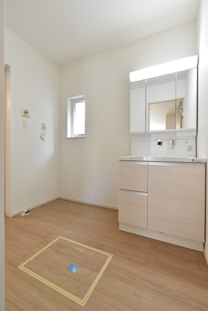 洗面室は、洗濯機を置いても、追加で収納家具を置ける広さがありました。