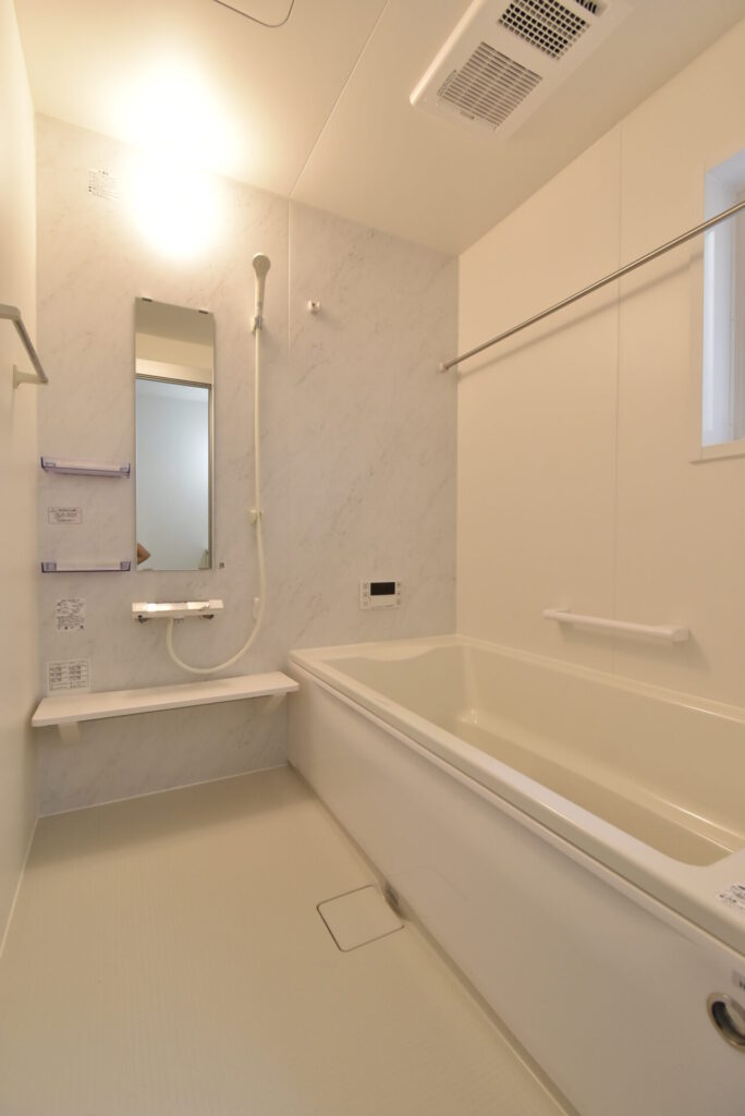 ホワイト!で清潔感のある浴室です。暖房乾燥換気付きで、雨の日や花粉の多い時期の衣類乾燥にも困りません。浴室を出て、2階へあがりましょう。