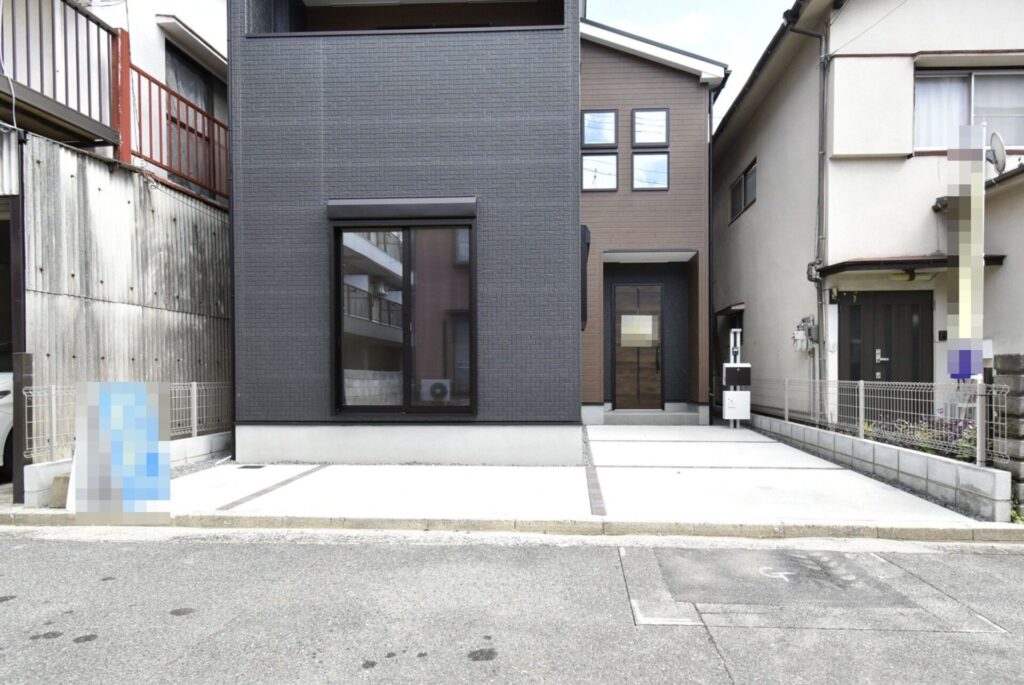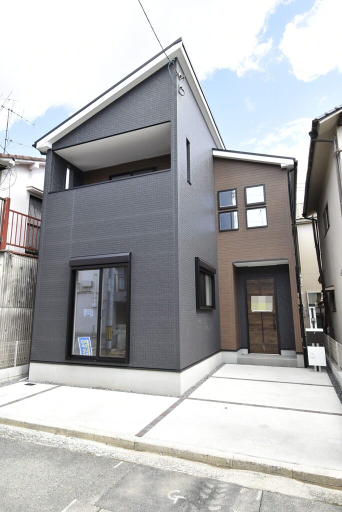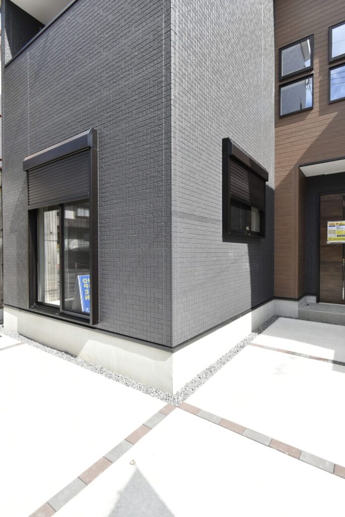 ブラック×ブラウンで、スタイリッシュな印象の外観です。玄関前には宅配ボックス付きのポストがありました。