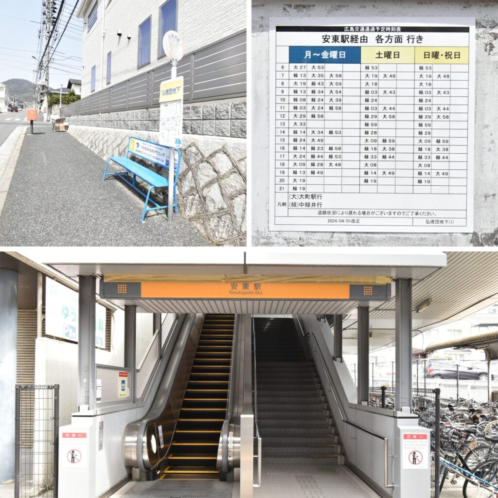 上・最寄りのバス停は「弘奥団地下バス停」(約140m 徒歩2分)。アストラムライン安東駅を経由して、大町駅や中緑井に向かうバスが出ています。/下・”今日は「アストラムライン安東駅」(約750m 徒歩9分)まで歩いてみようかな!”という日には、運動がてらテクテクと歩いて駅に向かうことのできる距離感です。帰りは登り坂になるので、帰りはバスという手もあります!(笑)