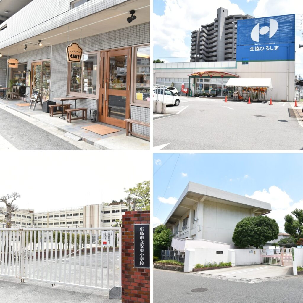 左上・アストラムライン安東駅近くには、パン屋さんとケーキ屋さんが一緒になった「ラ アンジェ」(約750m 徒歩10分)があります。チーズ塩パンもスタッフの方々の評判もgood♪/右上・物件から一番近いスーパーは、新鮮な野菜が並ぶ「コープ安東」(約1.9km 車4分)。/左下・小学校区は「安東小学校」(約750m 徒歩10分)、/右下・物件から一番近い保育園は「安東保育園」(約1.2km 車3分)です。