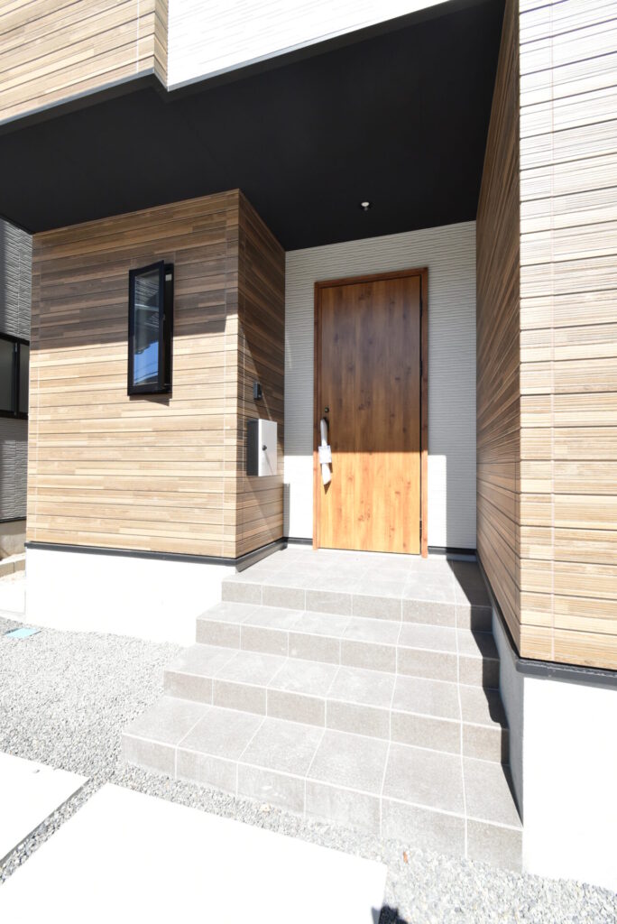 ウッドテイストでおしゃれな玄関前。屋根がしっかりとかかっているので、雨の日も落ち着いてドアの開け閉めができますよ。ドアすぐ横にポストがあるので、郵便物も取り出しやすく◎