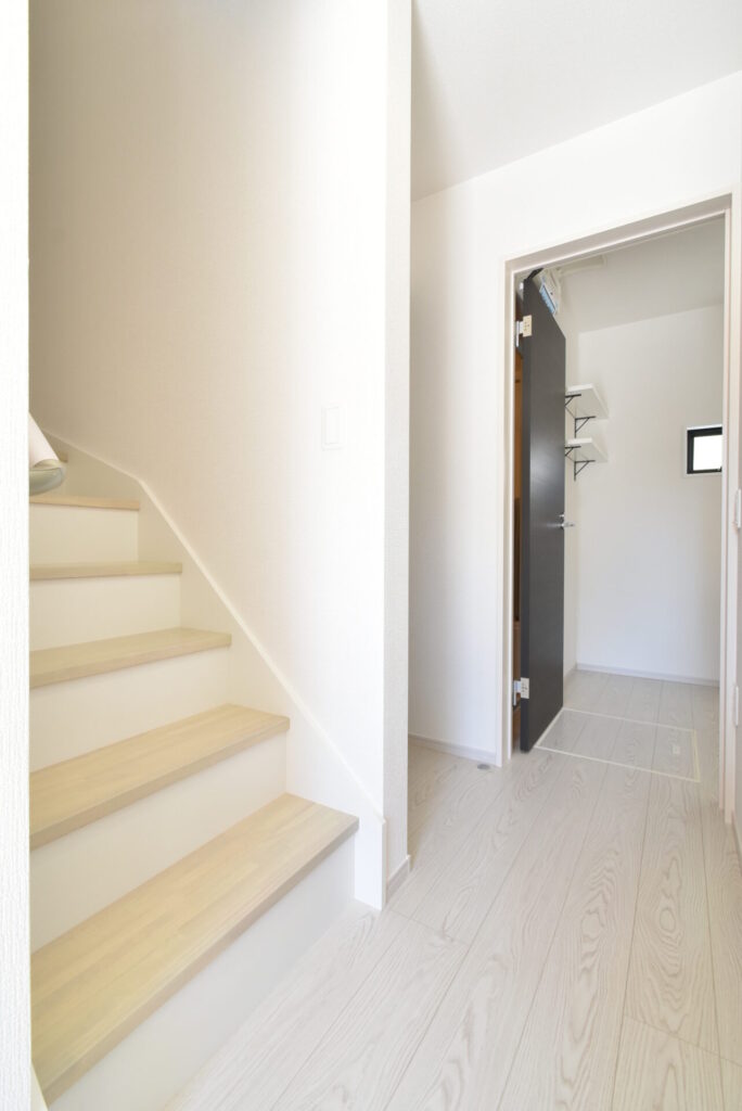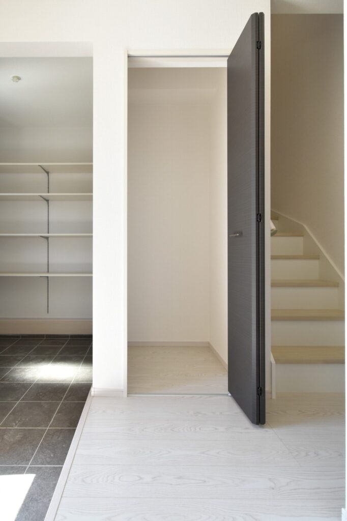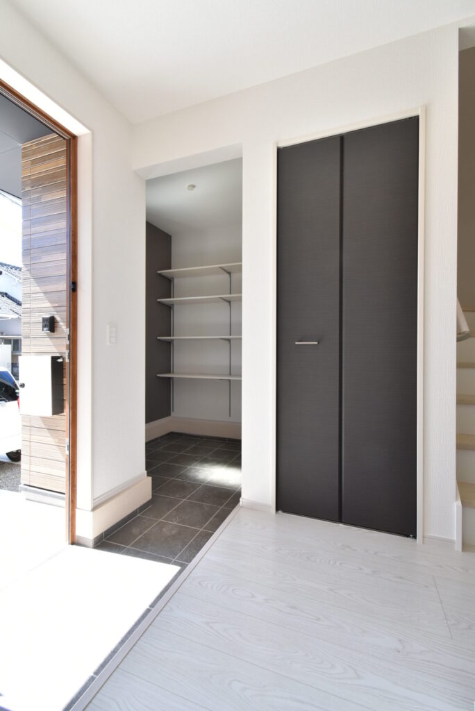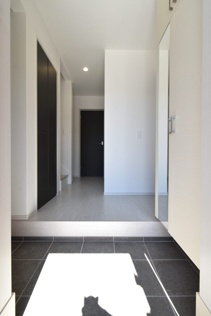 外観のウッドの雰囲気とはまた違った、モノトーンならではの落ち着きを感じる玄関。
