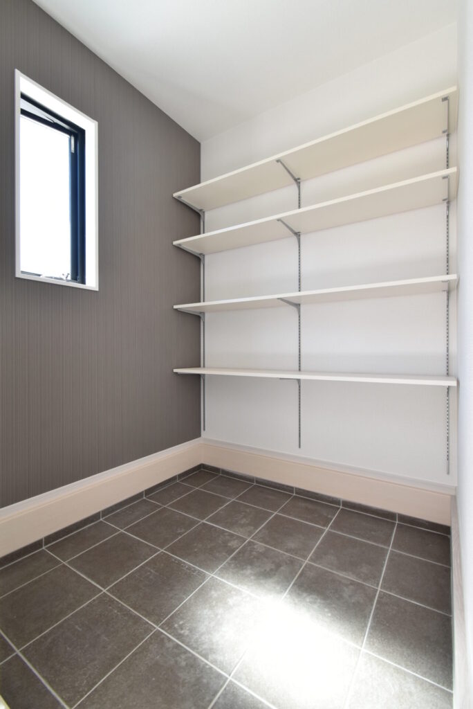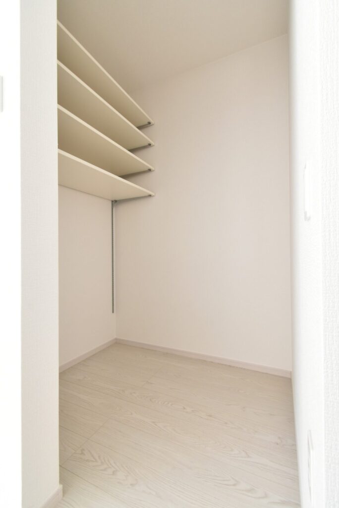 約1.5帖のパントリー。衣装ケースを置いて子供の服を収納すると、慌ただしい朝のお着替えもパパッと済ませることができます。可動棚には園や学校から持ち帰る書類を収めもいいですね。
