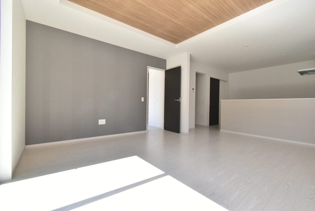 コーヒー片手にソファに座ってくつろいでいるアングルはこちら。テレビの設置場所はグレーのアクセントウォール前になります。