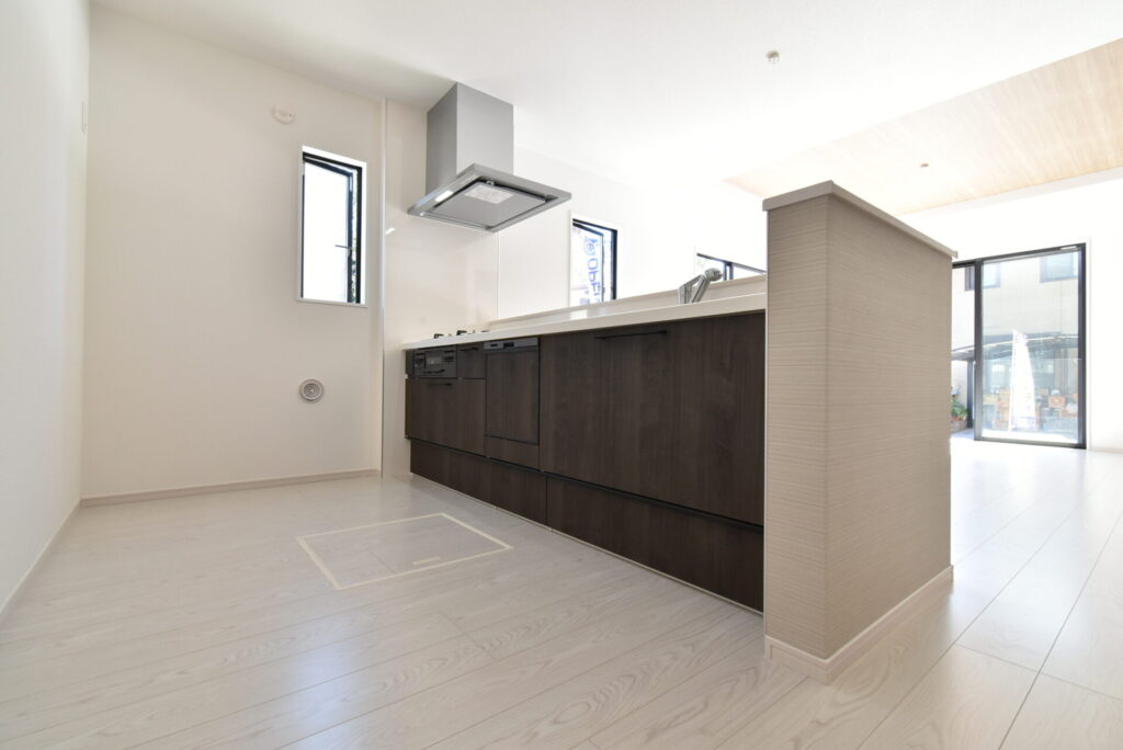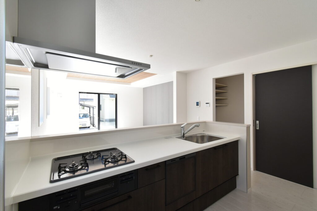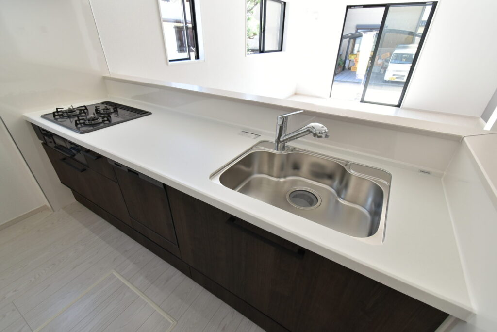 キッチンは、広々としたシンクと作業スペース、火力抜群のガスコンロ、そして食洗機付き!食事の準備も片付けも、スムーズにできそう。