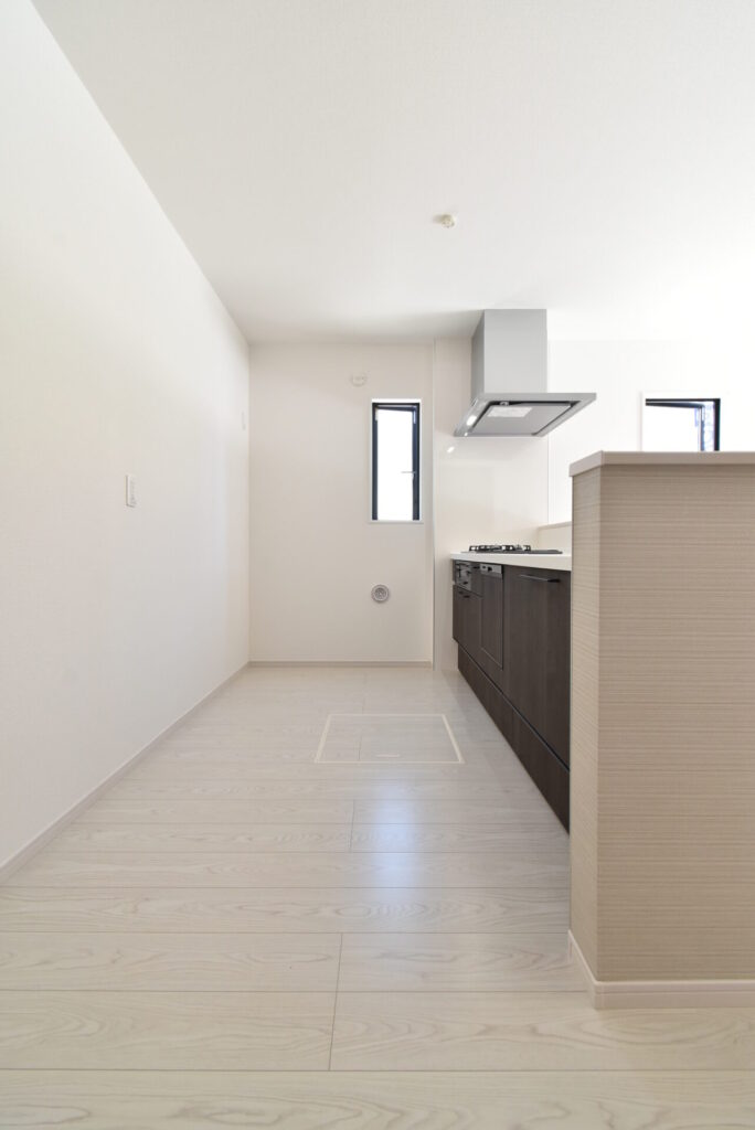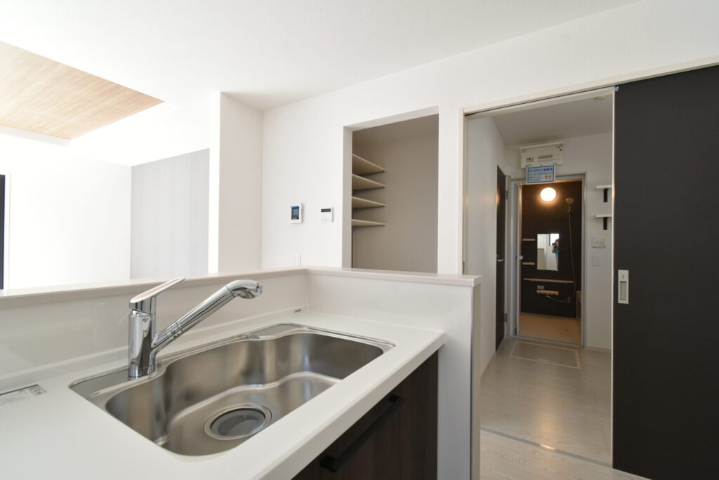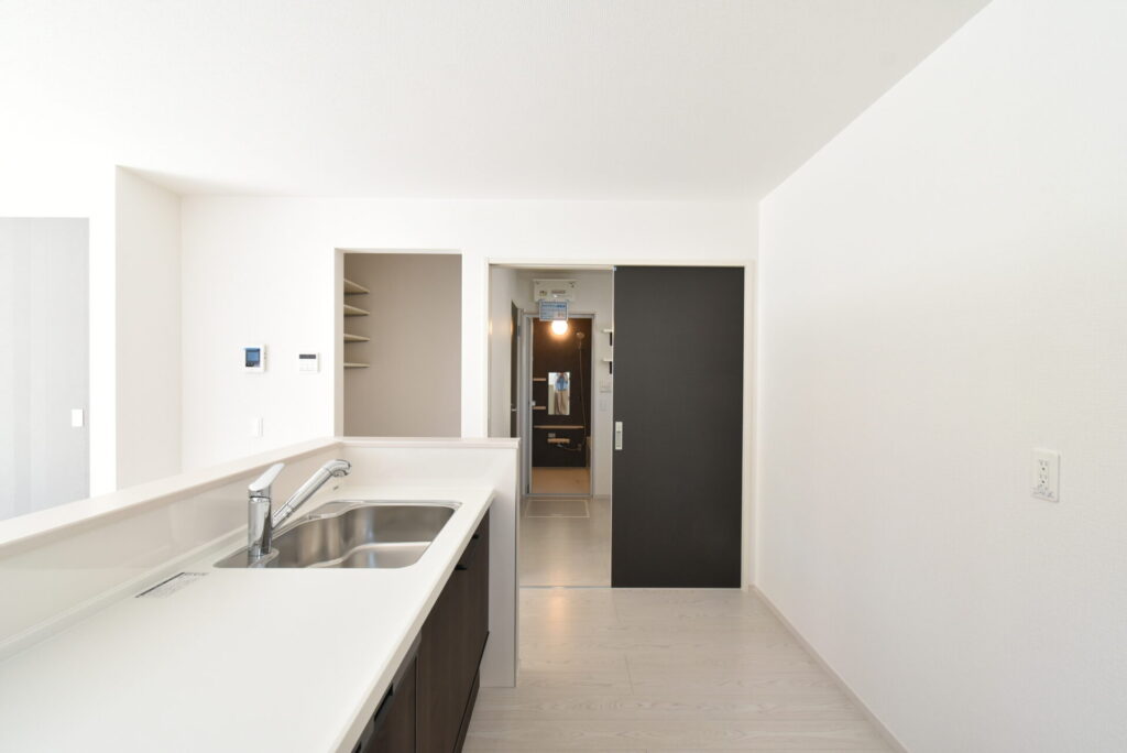 くるりと振り返ってみると、キッチンまでこの通り一直線!外遊びから帰って来た子どもが入浴しているときも、キッチンで家事をしながら様子を伺うことができます。写真右に見えているドアを開けると・・
