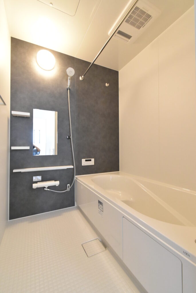 浴室乾燥機付きの浴室。浴室乾燥機能と換気の機能を併用すれば、浴室を素早く乾かせるので、カビの発生も効果的に防ぐことができますよ。