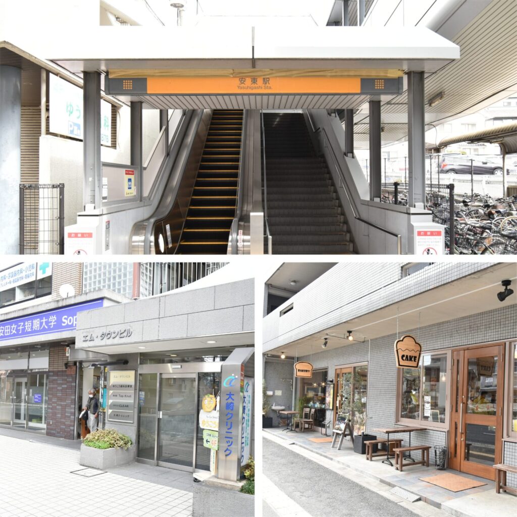 上・アストラムライン安東から物件まで徒歩9分。(約700m)/左下・駅周辺には、内科・小児内科や小児歯科がそろっており、家族で通院することができます。/右下・パンもケーキも買える「ラ アンジェ」。「これもあれもおいしそう♪」の言葉が飛び交う、私の大好きなお店です。来客用のお茶菓子はここで決まり‼