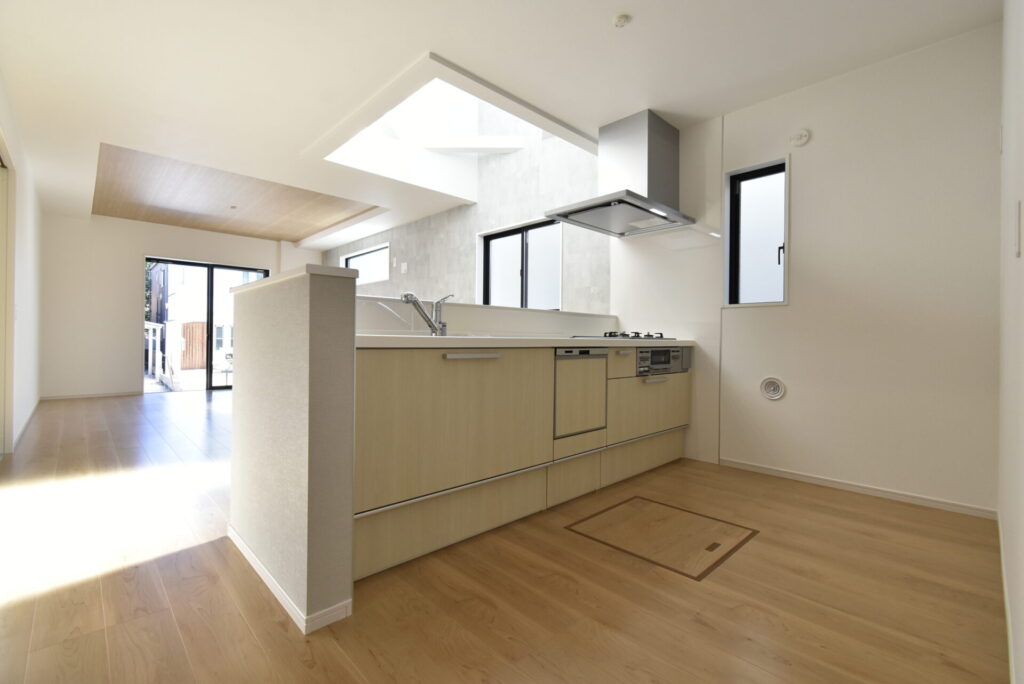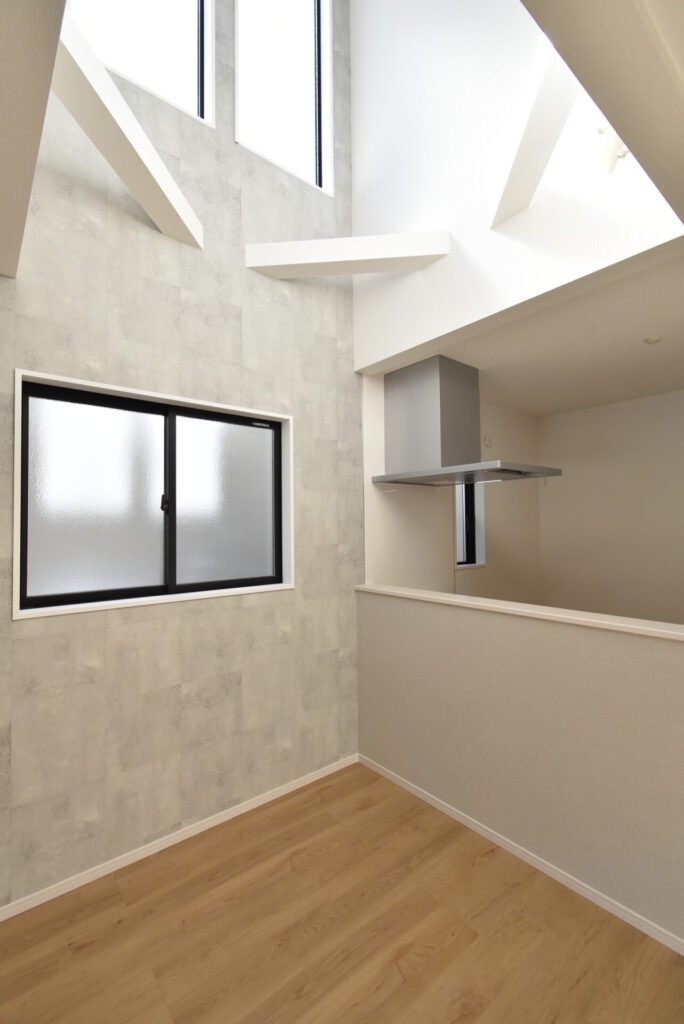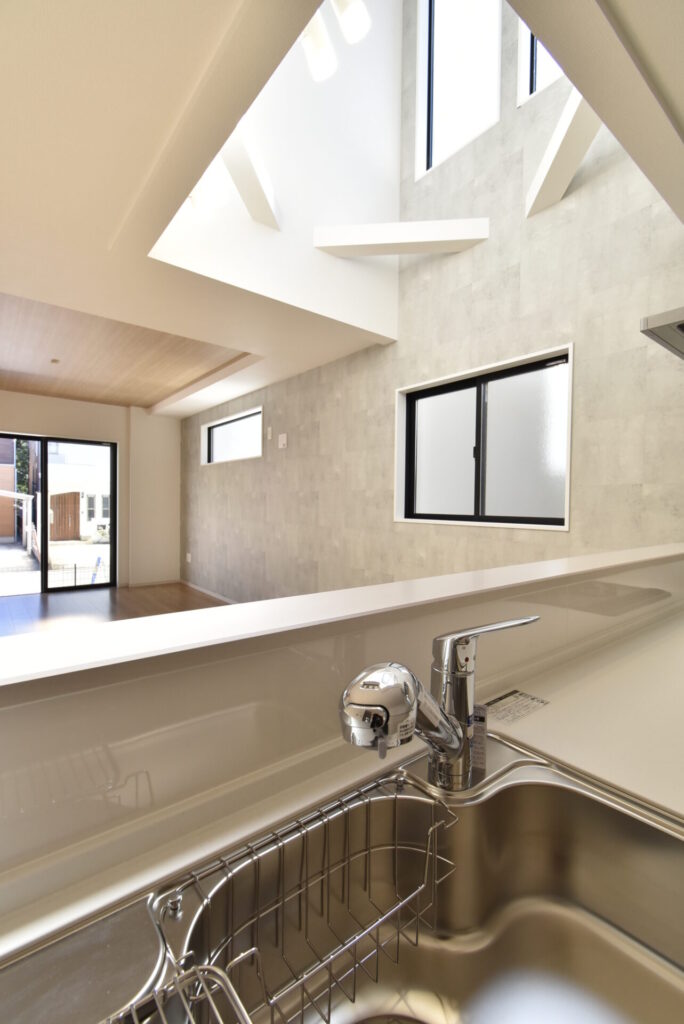 キッチンからのアングル。休みなく続く家事に疲れた時は、ふと見上げてみてください。太陽から採光のパワーが受け取れ、きっと心が少~し軽くなるはず♪