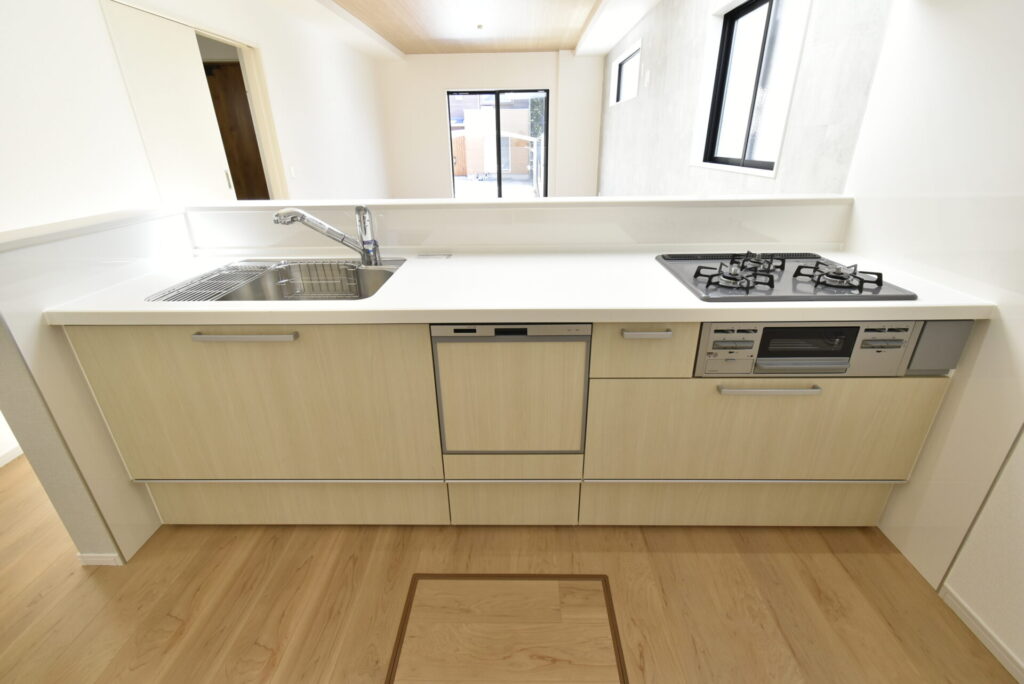 キッチンの設備は、家事のお助け隊となってくれる食洗機と3口ガスコンロが付いています。もちろん収納も豊富でしたよ~。