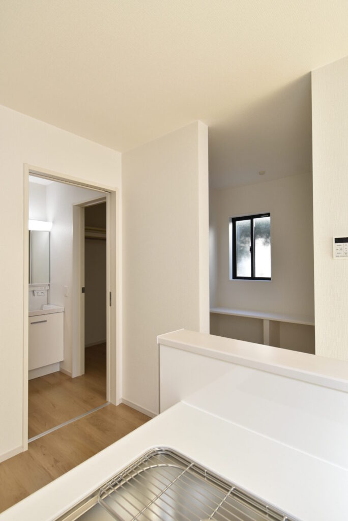 最短で出かける支度が済むこの回遊動線は、めちゃくちゃ便利。帰宅時は朝とは逆回り!ここにカバンを置いて、クロークにて部屋着に着替え、洗面室で手を洗う!この生活動線、文句なしに快適です♪