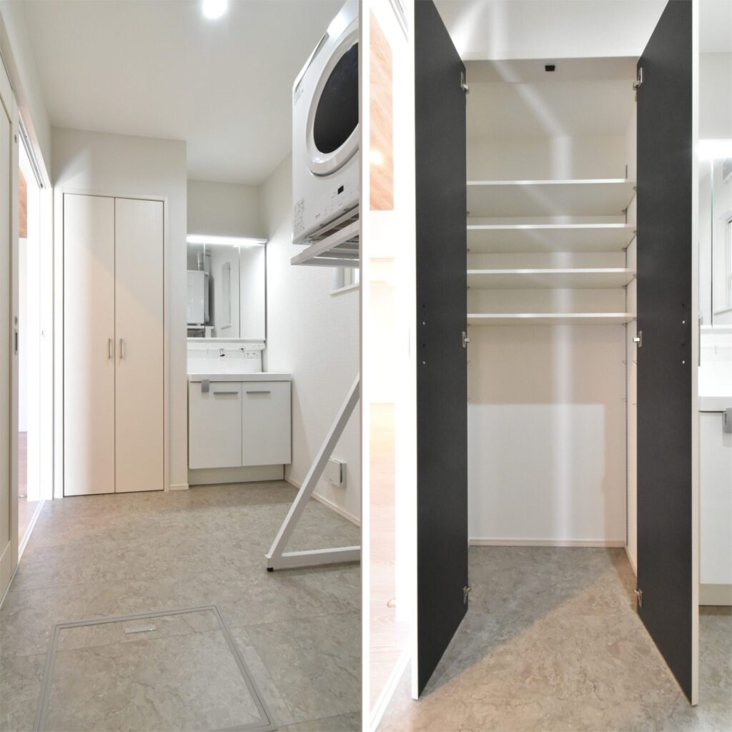 洗面の隣りには、タオルや日用品を収めておける収納がありました。扉がついているので、来客時も収納が丸見えにならず◎床には洗剤のストックが収まる、浅めの床下収納もありました。