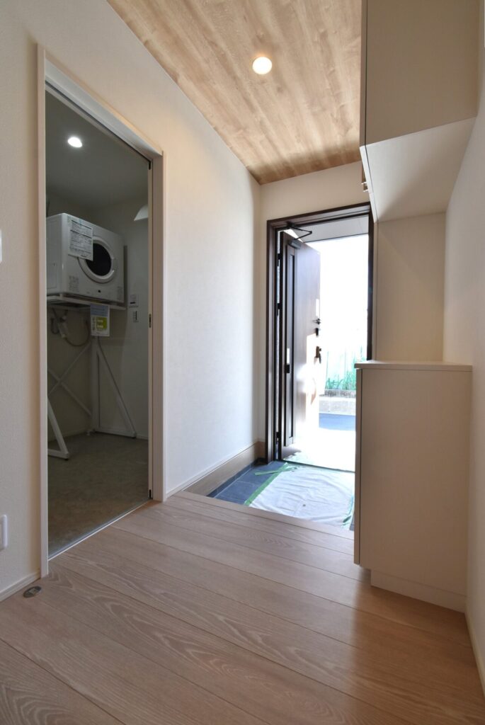 玄関上がってすぐ隣にある戸を開けると、水回りスペースがあります。帰宅後すぐに手洗いができる便利な動線です。