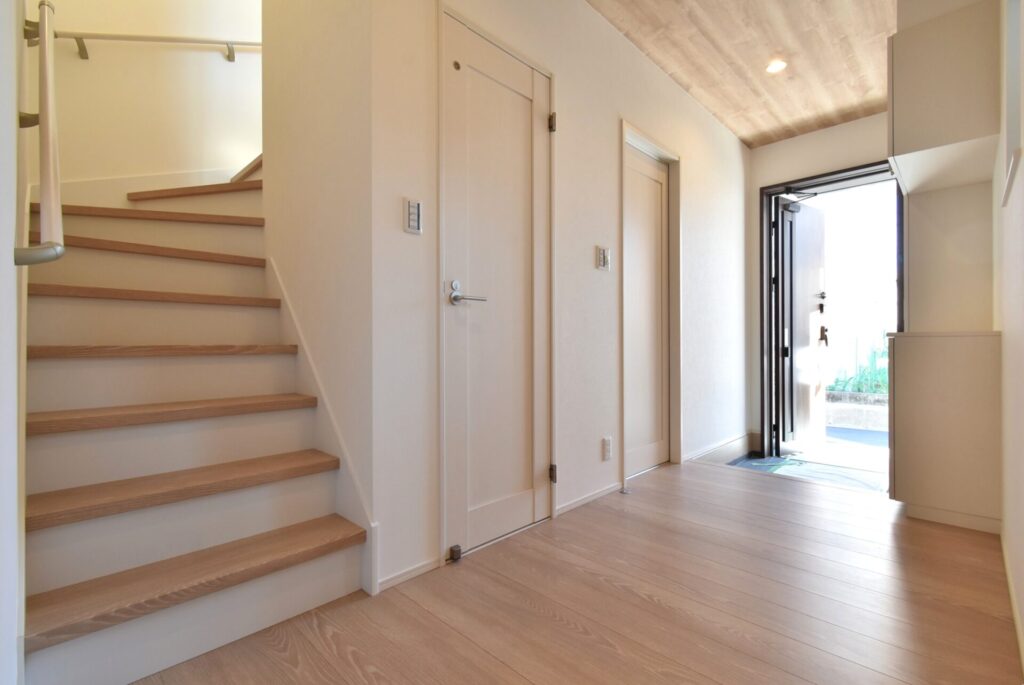 玄関入口からのビューも素敵でした。玄関ホールの奥行きが開放感を生み、天井の木目がアクセントになっていておしゃれな印象でした。