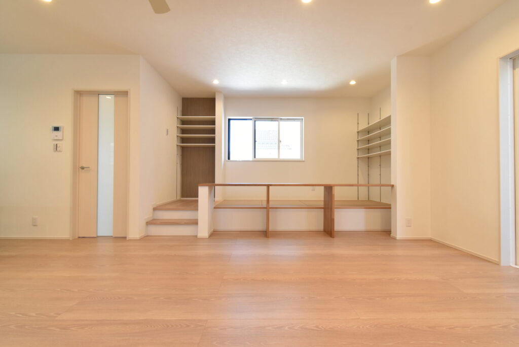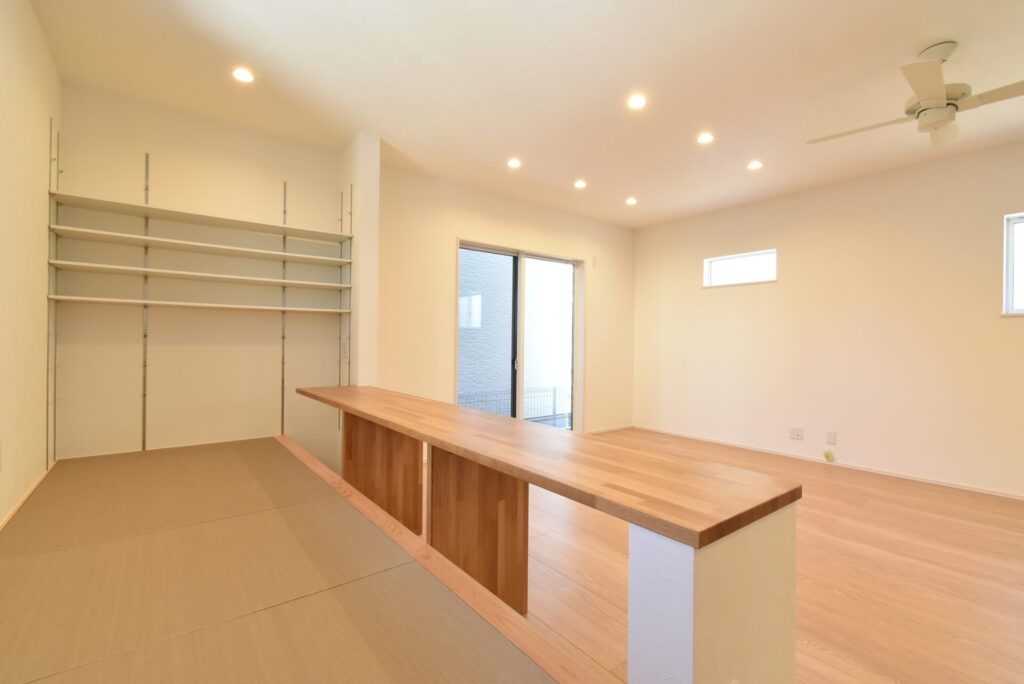 カウンターで空間がゆるく仕切られたホビースペース。小上がりになっているので、リビングとはまた違った、ちょっぴり特別感のあるくつろぎスペースです。