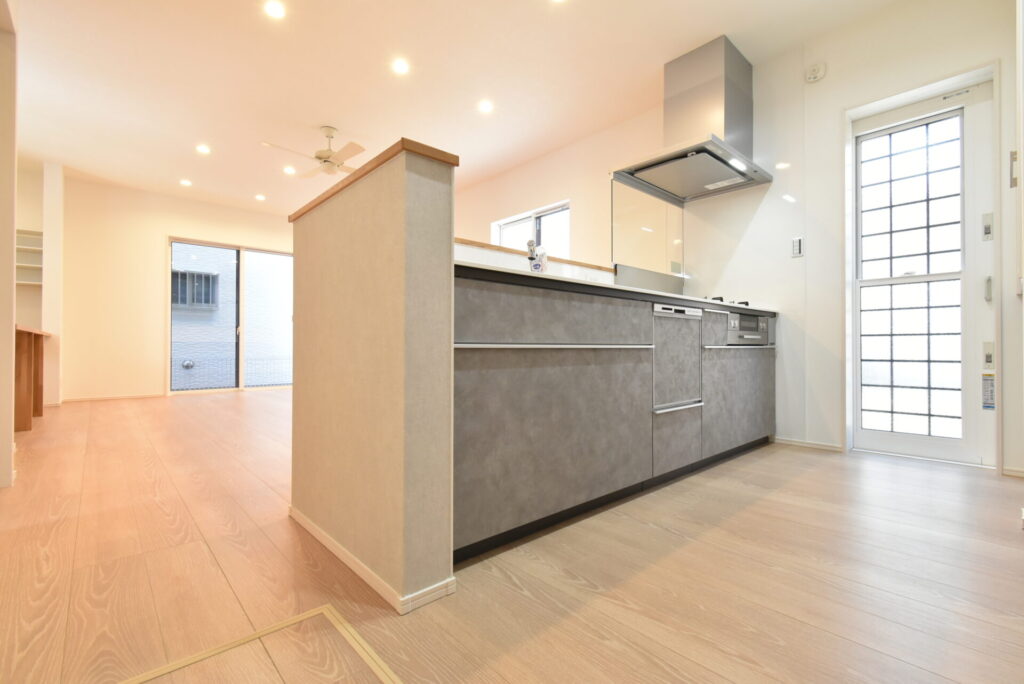 落ち着きのあるグレーカラーのキッチン。汚れも目立ちにくく◎