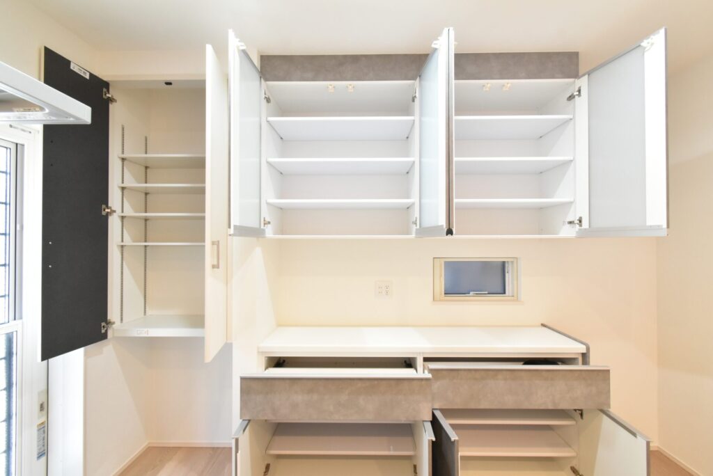 「大皿はあの辺に収納して、コップはこっちかな~」なんて想像を思う存分楽しめる、余裕のある収納スペースも完備です!お気に入りの食器をた~っぷり収めたいですね♪