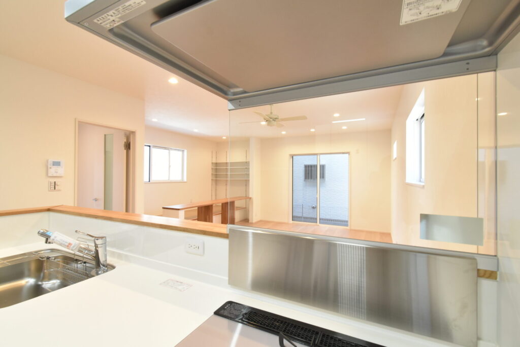 キッチンビューはこちら!コンロ前のパネルがクリアになっているので、開放感満載!リビングやホビースペースで過ごす家族の様子もうかがえますよ。パネルが換気扇の高さまであるので、ダイニング側への油の飛び散りを気にせず調理できます。