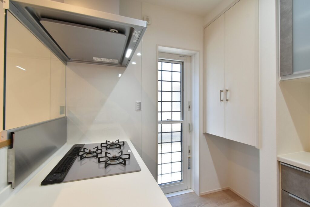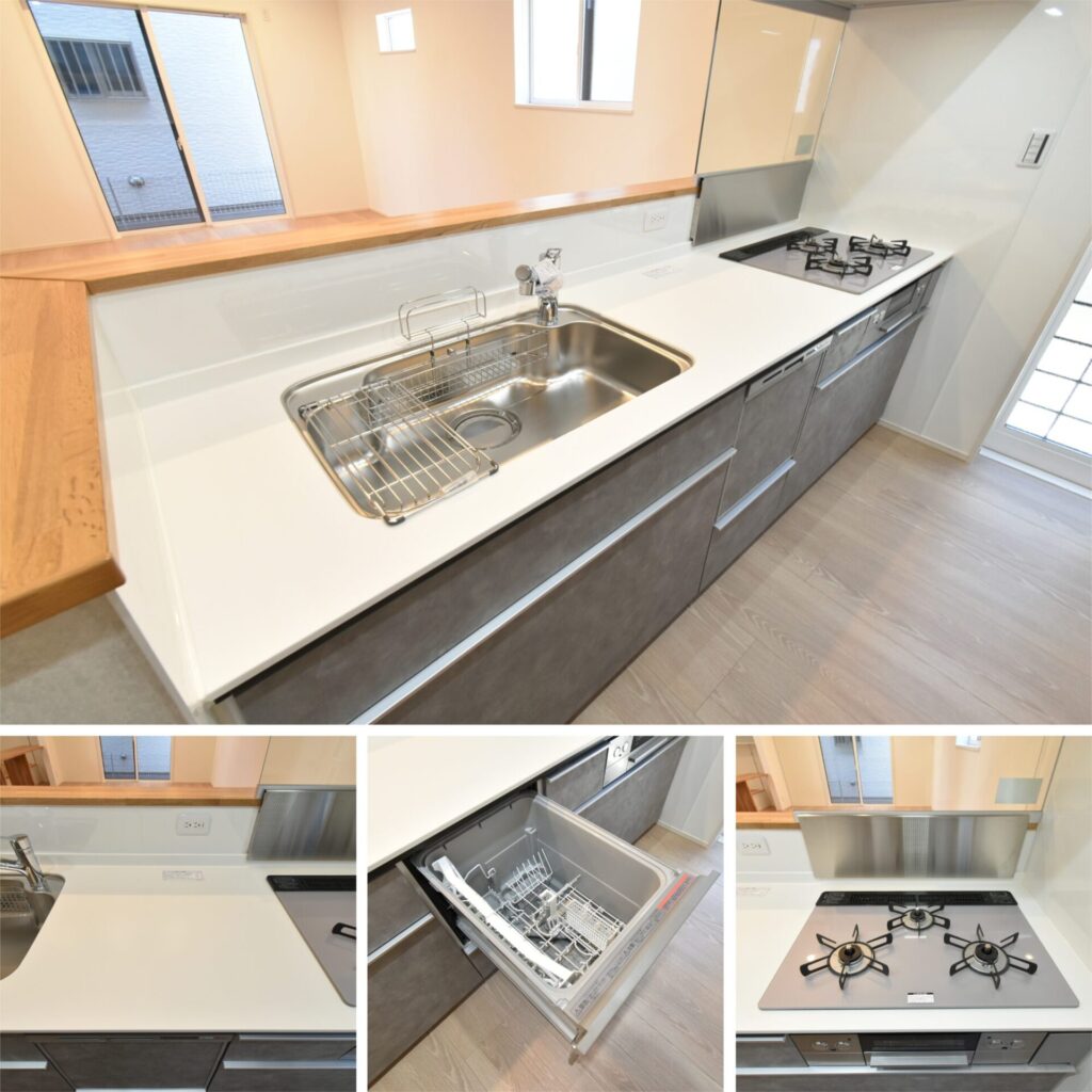 広々としたキッチンには、調理家電をサッと使えるコンセントや、家事の助っ人食洗機が備わっていました。コンロはガスコンロで火力も抜群ですよ♪