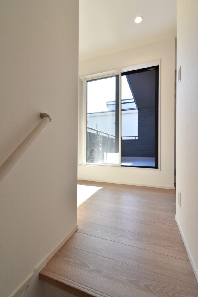 階段を上がると、光がたっぷりと差し込むホールとベランダが目の前に!お部屋を通らず、直接ベランダに洗濯物を干しに出ることができる便利な動線です。