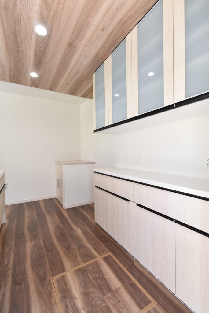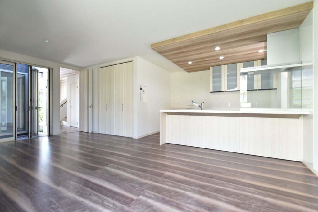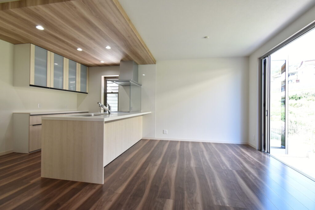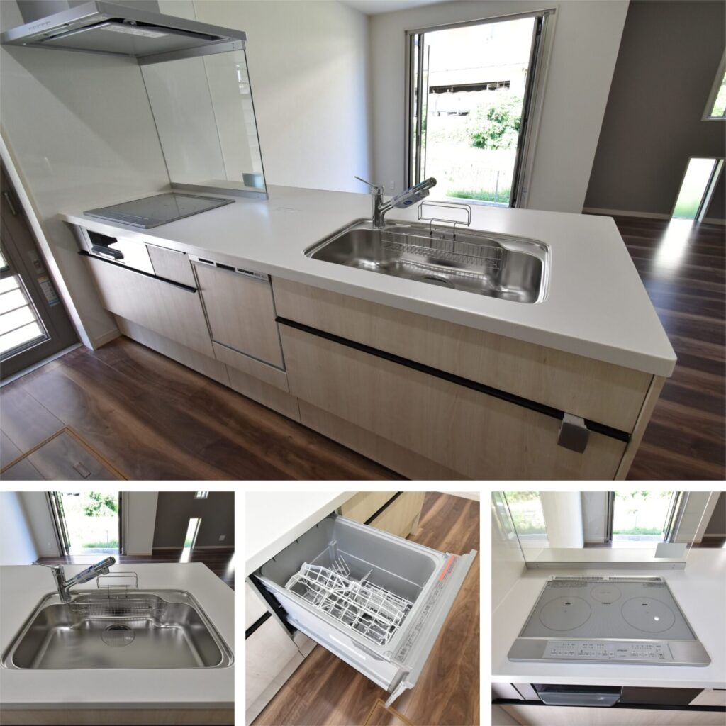 キッチンは、家族みんなで囲みやすいフラットタイプ。設備は浄水機能付き水栓・食洗機・IHクッキングヒーター。料理やお菓子作りをする時間が楽しみとなりそう。